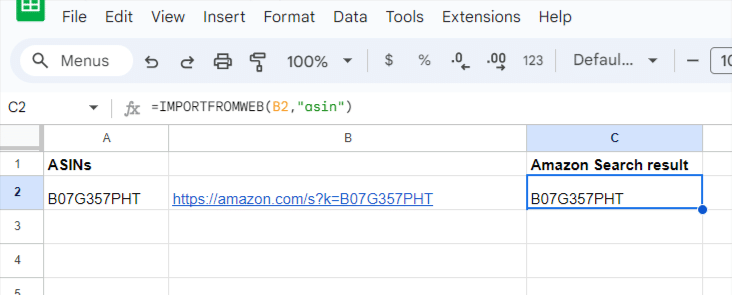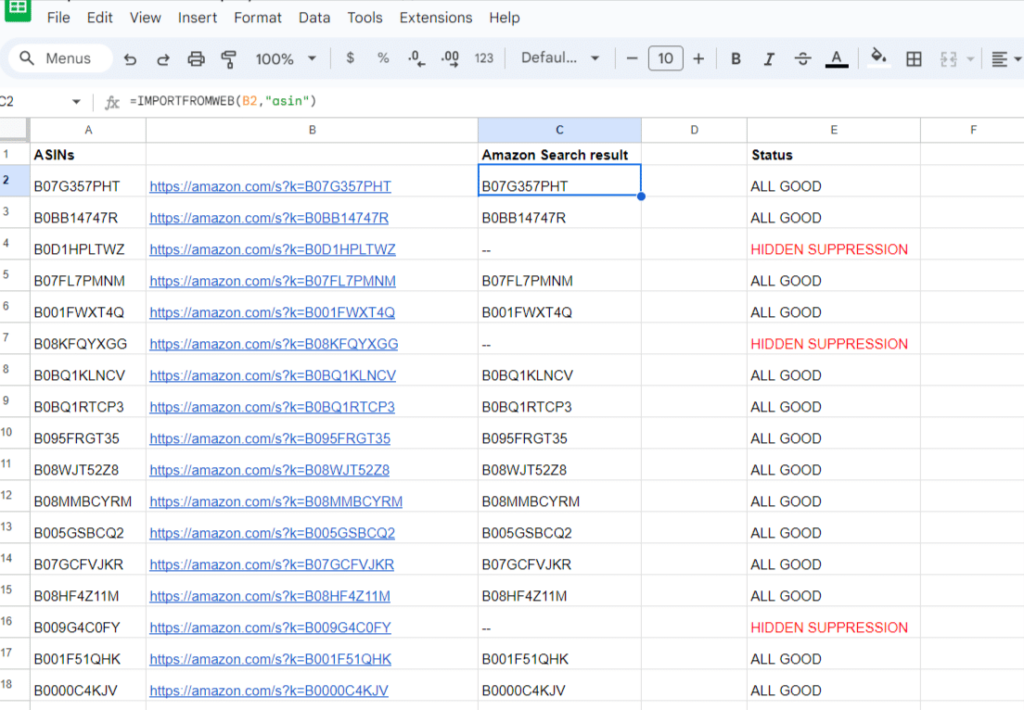 The IMPORTFROMWEB function that comes along with the plugin allows you to pull live data from Amazon. By automating queries for each of your ASINs, you can check their visibility status in Amazon’s search results.