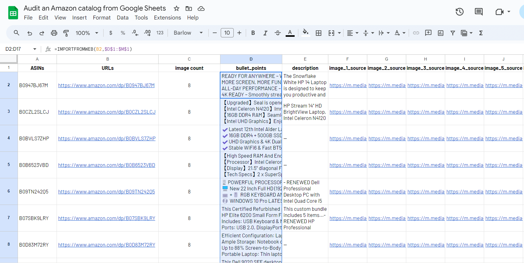 Maintaining a large catalog can be time-consuming, but automation tools can help you manage your listings more efficiently. Consider using Google Sheets add-ons (like ImportFromWeb) to automate routine tasks such as monitoring image count, bullet_points and descriptions. Automation can free up your time for more strategic activities, such as product development and marketing, while ensuring that your listings remain consistently optimized.