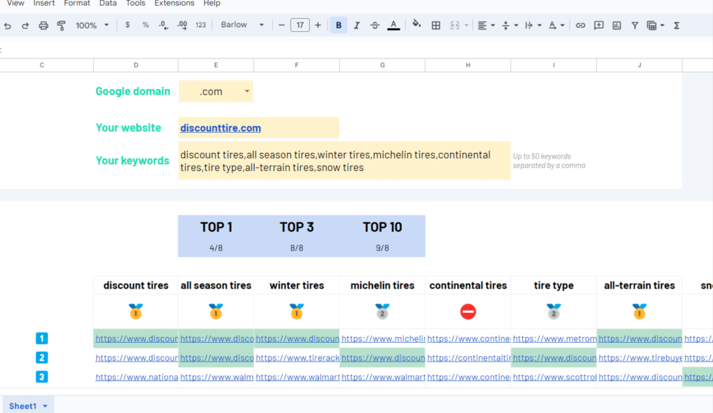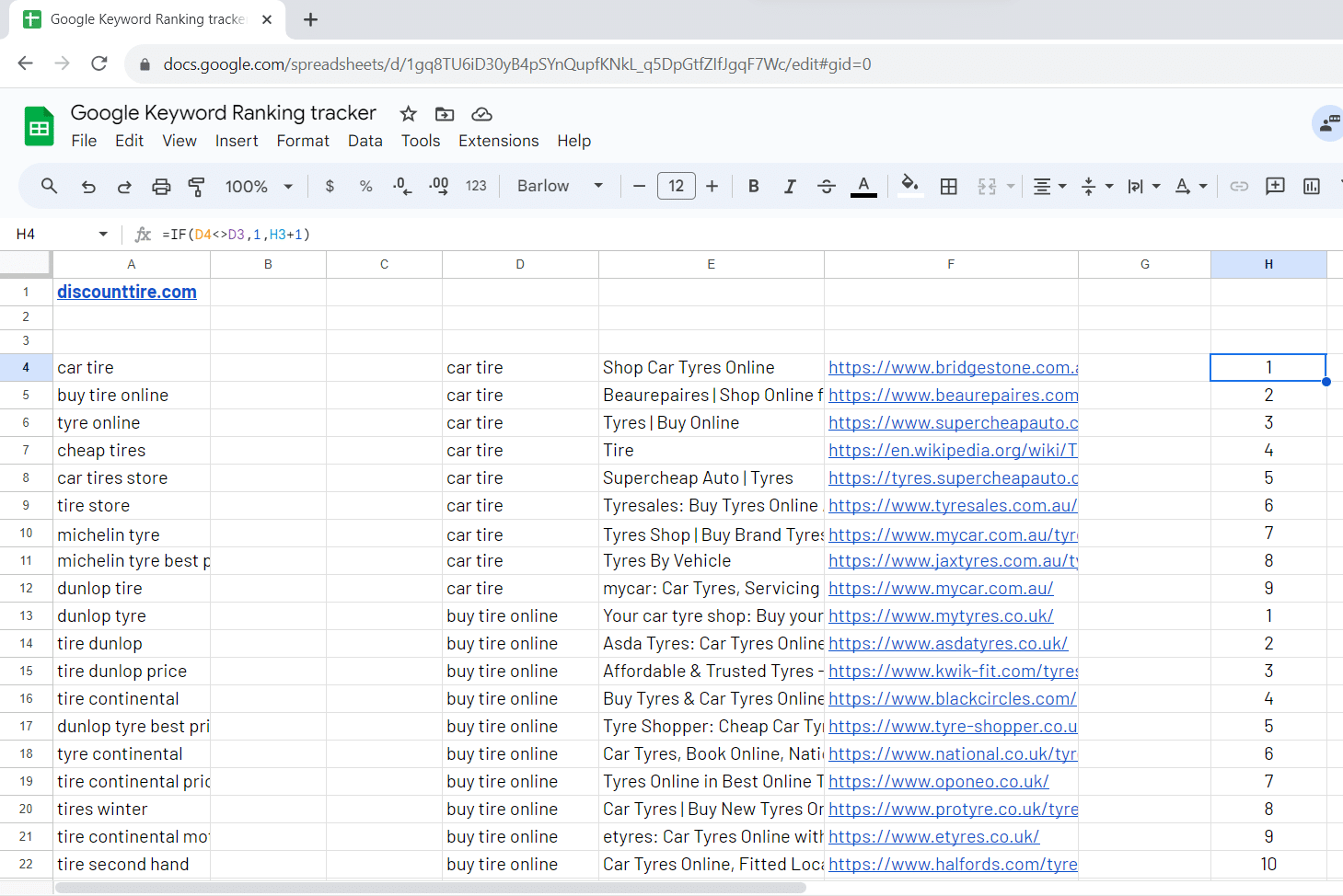 This formula adds next to each result a “✅” symbol indicating that your website (discounttire.com in our example) ranks for the keyword. The ArrayFormula ensures that the entire column F is processed at once.