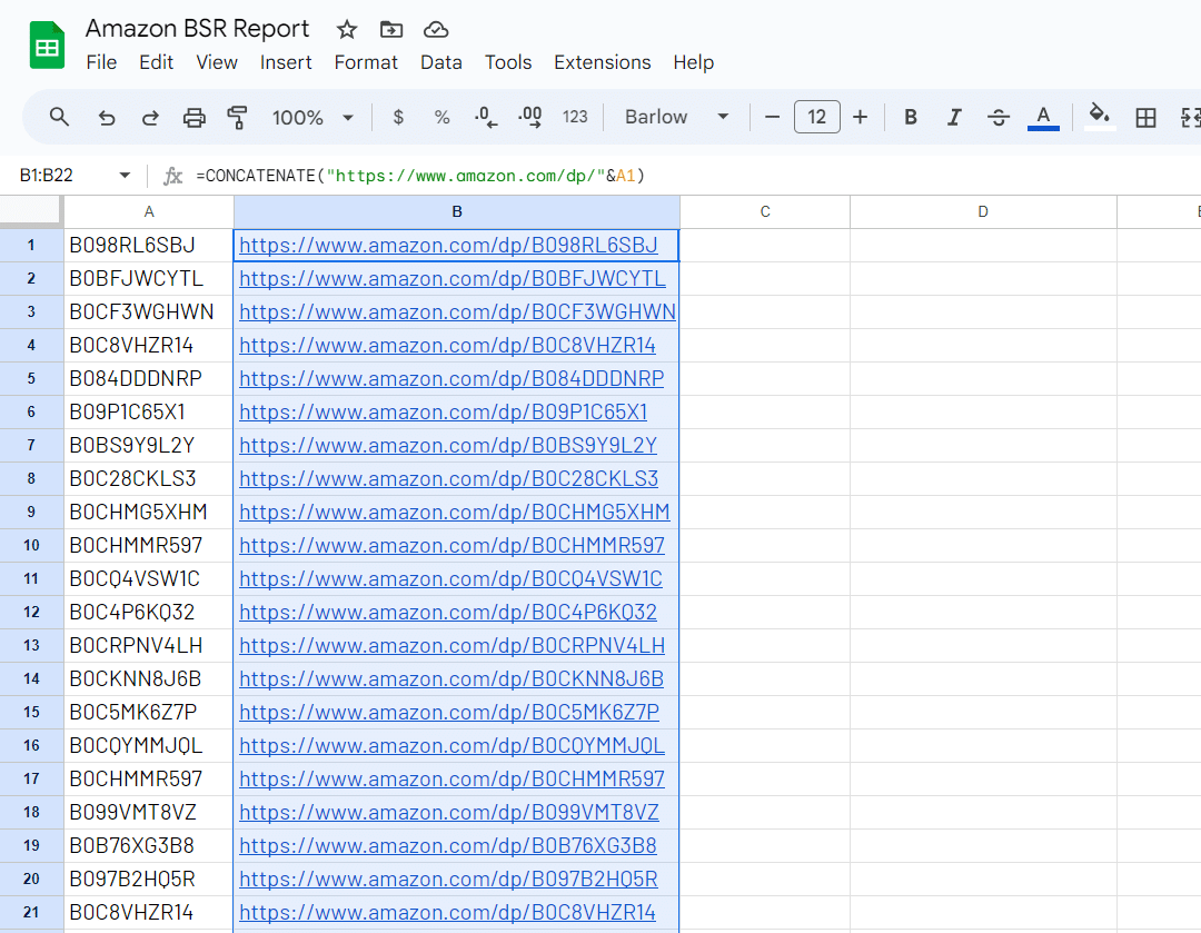Input your ASINs list in column A and we’ll use a =CONCATENATE() formula to build the URLs.