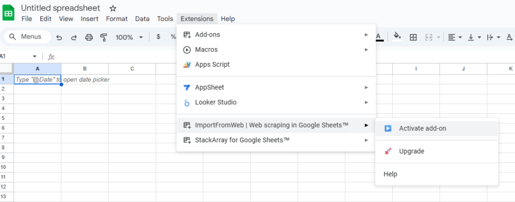 Open a new Google Sheets spreadsheet and go to Extensions > ImportFromWeb > Activate add-on.