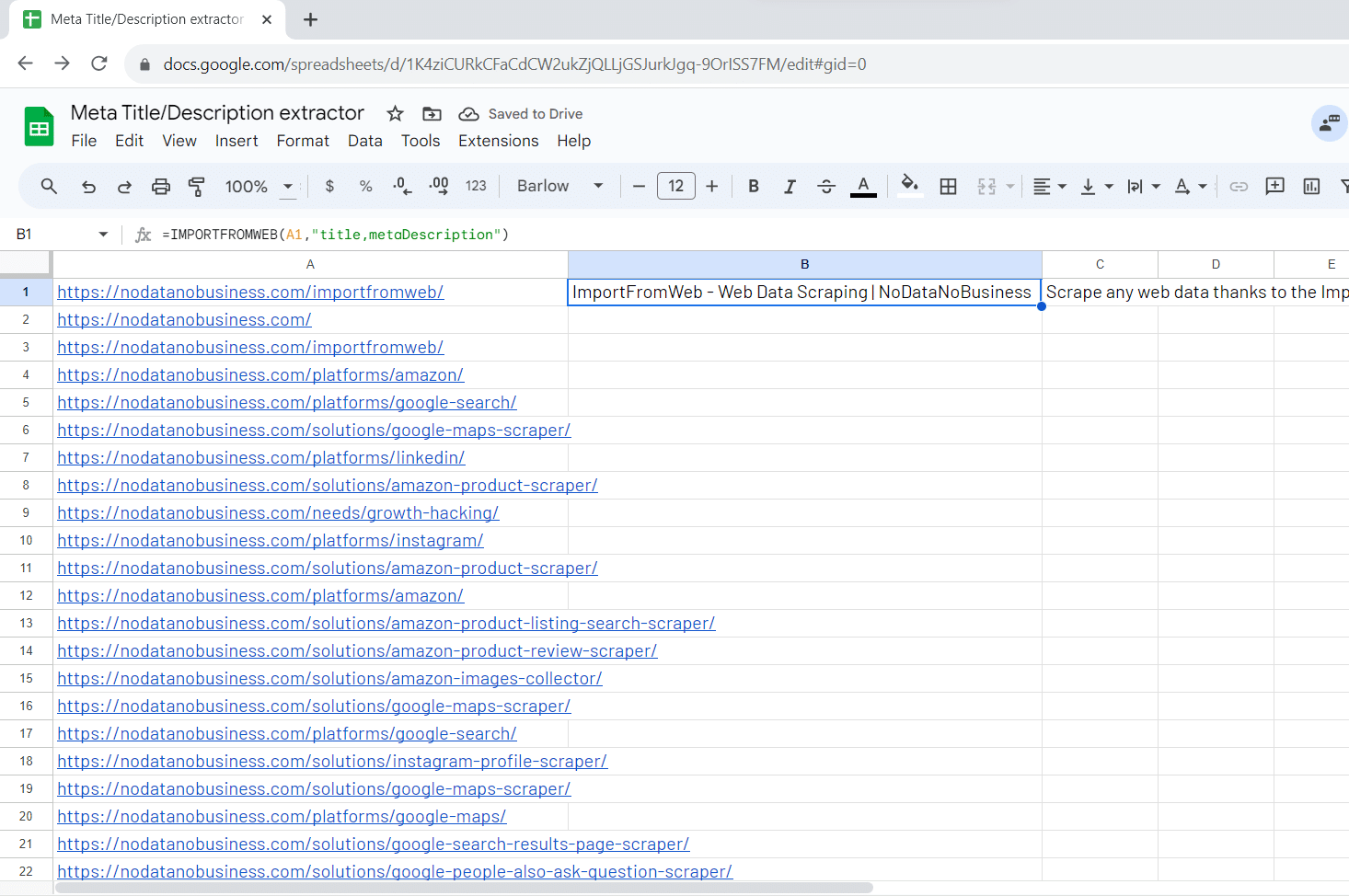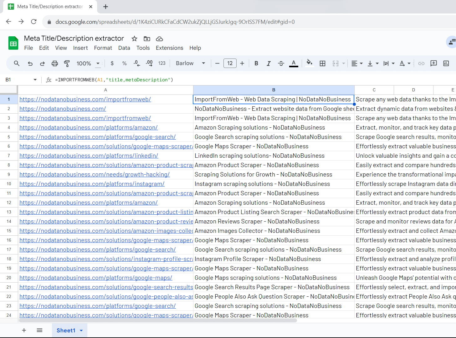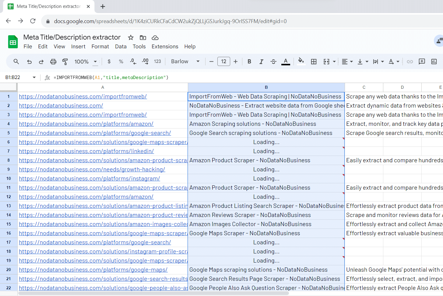 The process relies on a simple Google Sheets function, named =IMPORTFROMWEB(), that requires 2 parameters: a webpage URL and a list of data selectors, in our example “title” and “metaDescription”. Executing the function enables you to auto-collect the metadata and populate them in a single table.