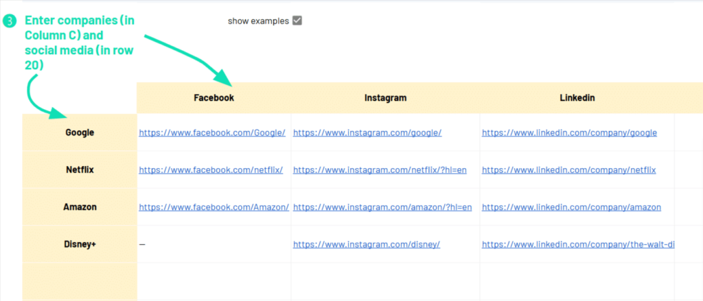 =IMPORTFROMGOOGLE()function to find social media links. - Apply the formula to the entire list for quick, comprehensive results.