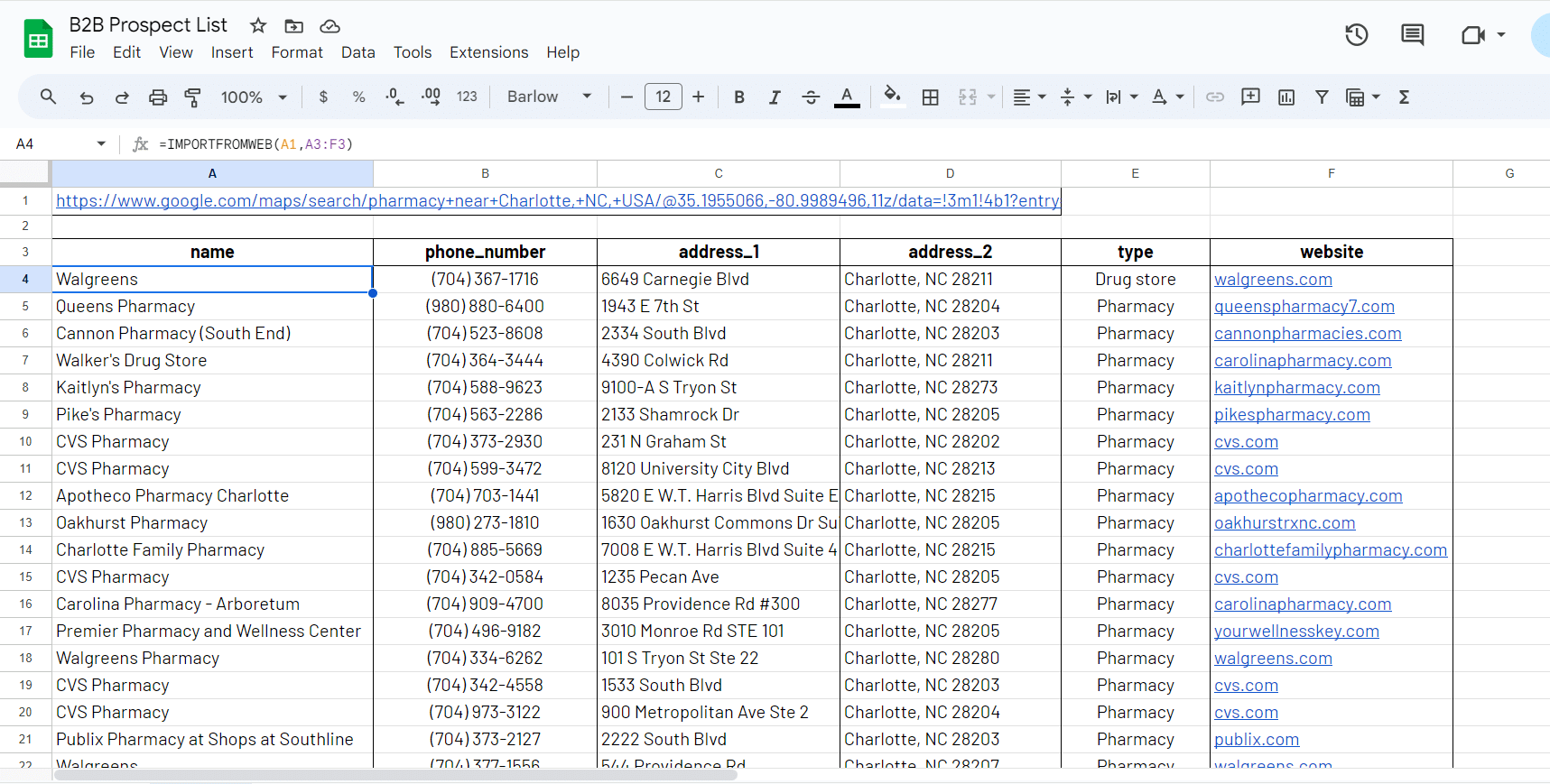 Once executed, the =IMPORTFROMWEB() formula outputs the results in your table. Here you are with already up to 200 pharmacies in North Carolina along with their details!