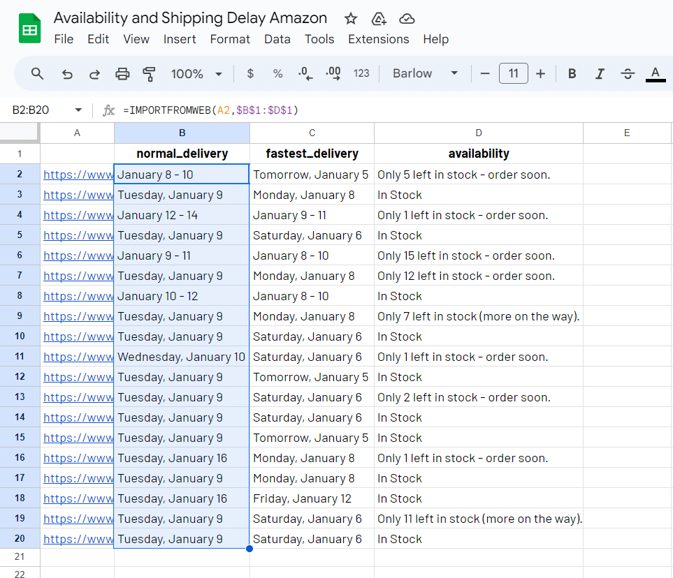 =IMPORTFROMWEB("Amazon product URL", "normal_delivery,fastest_delivery,availability")
