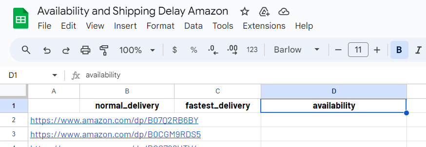 Enter the headers that will determine the data points to be extracted. In our case, we want to scrape the availability on your products, the default delivery date, and the fastest delivery date. The selectors for these data points are availability, normal_delivery and fastest_delivery. Let’s write them in B1:D1.