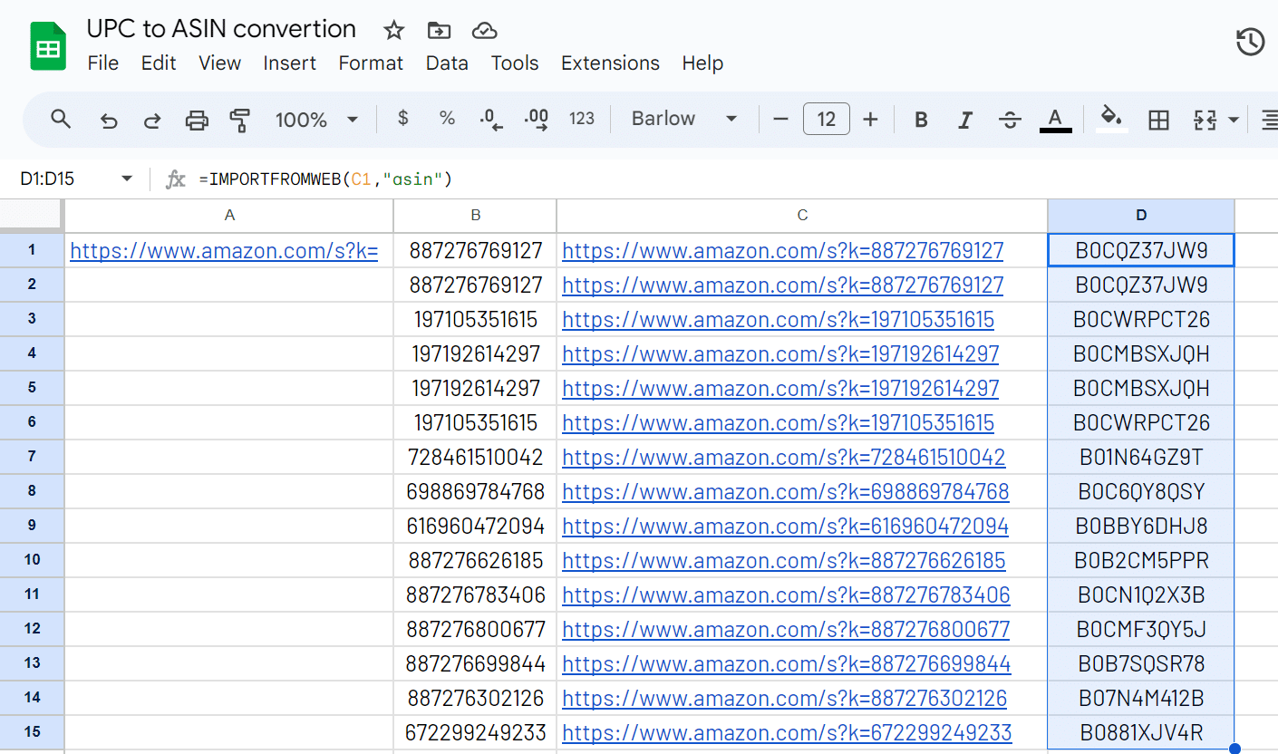 Enter the =IMPORTFROMWEB() formula in D1: =IMPORTFROMWEB(C1,"asin")