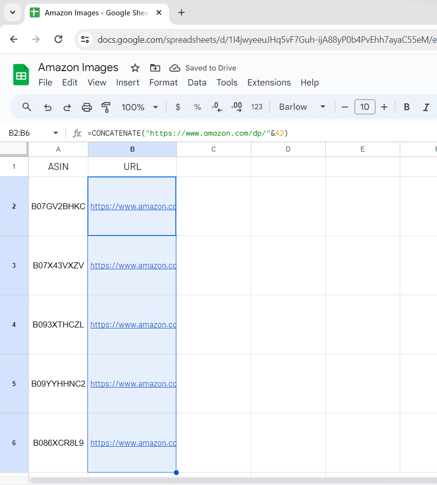 Let’s consider you’ve input your ASINs in column A. You can now build your product URLs ASINs in the column B with this simple formula: