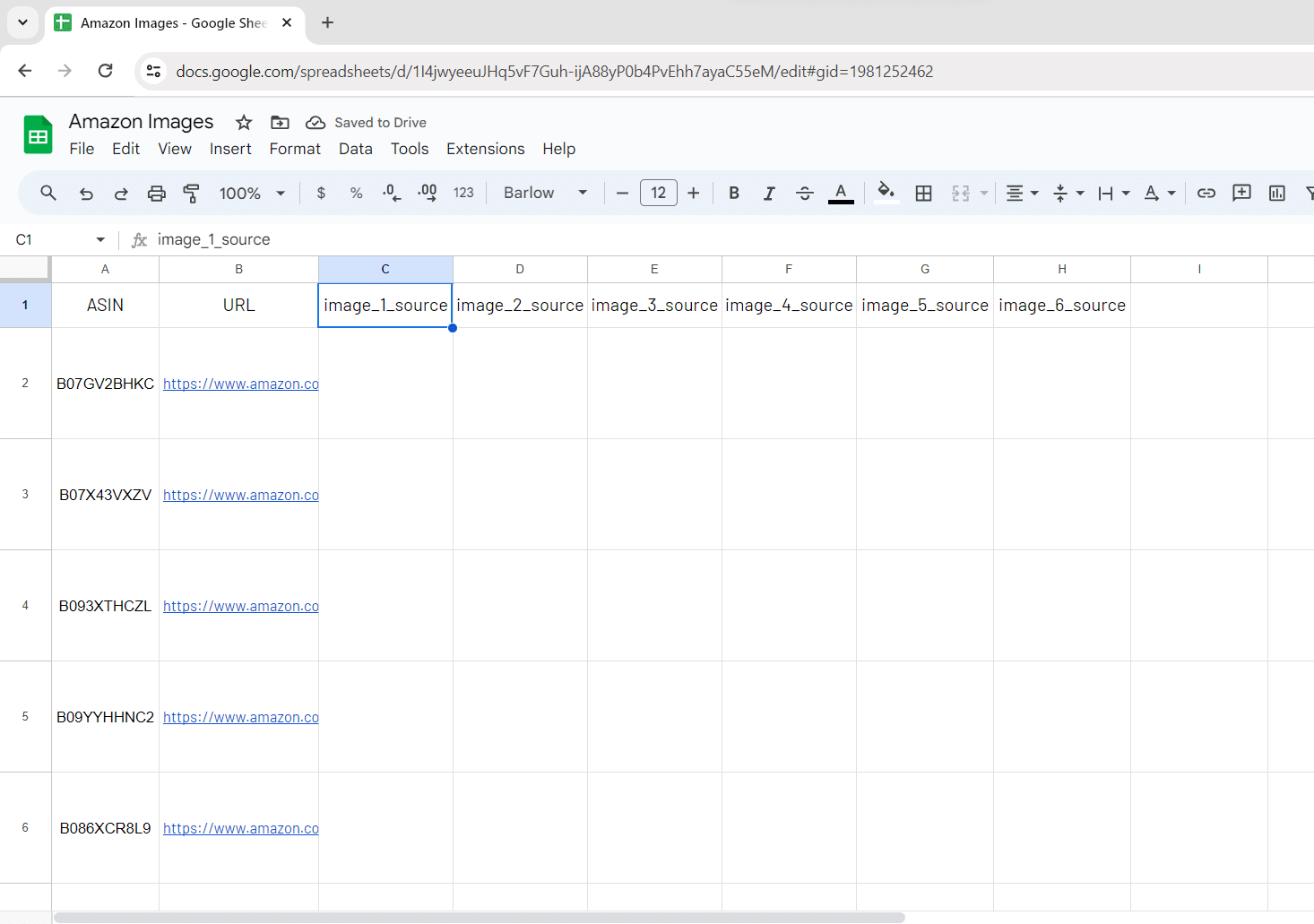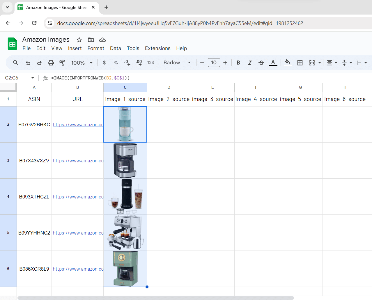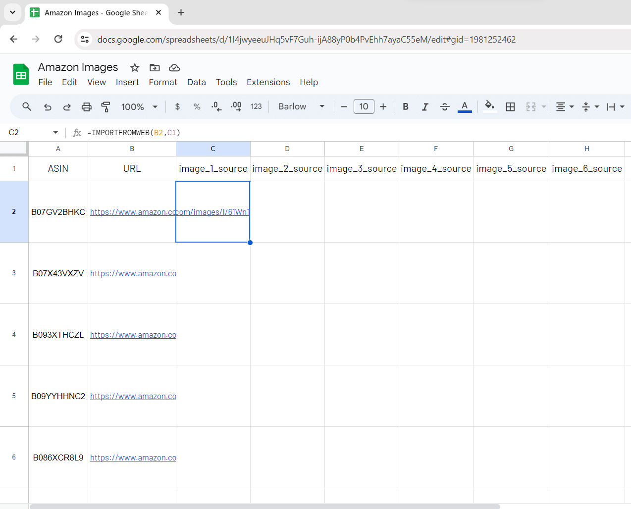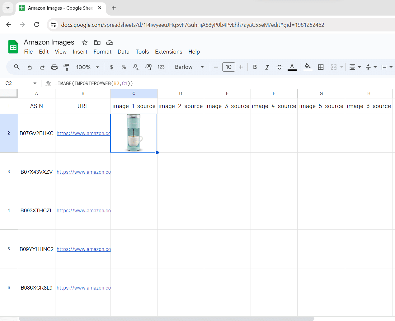 Here’s the formula you have to input in cell C2 so you will ask for the 1st image source URL of your 1st ASIN: