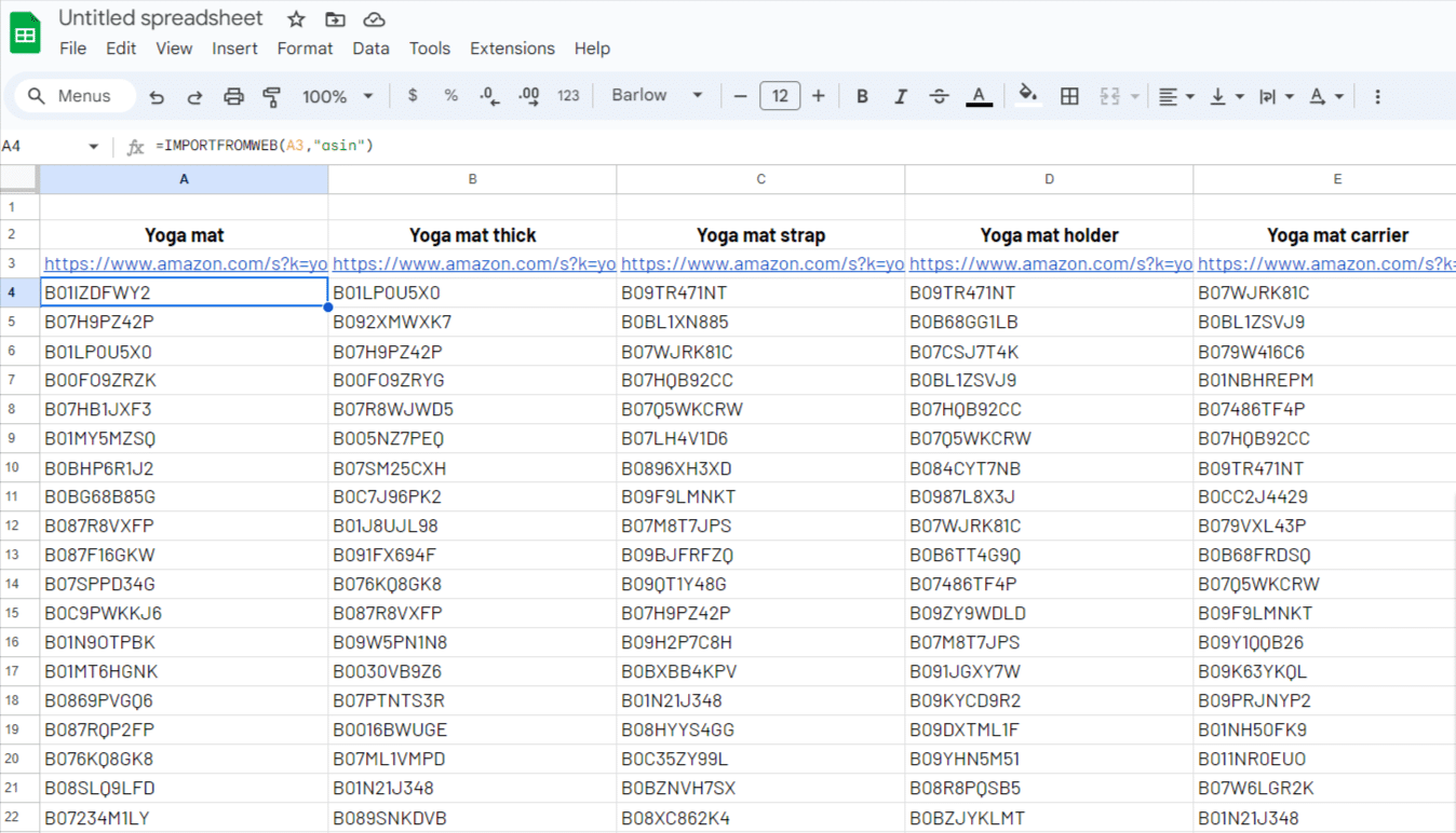 You may also want to go beyond results page #1 to track your ASINs or your competitors’ ASINs. Luckily, the Amazon search url contains the page number as a parameter (https://www.amazon.com/s?k=yoga+mat&page=2). Then, all you have to do is to replicate the =IMPORTFROMWEB() function with each URL: