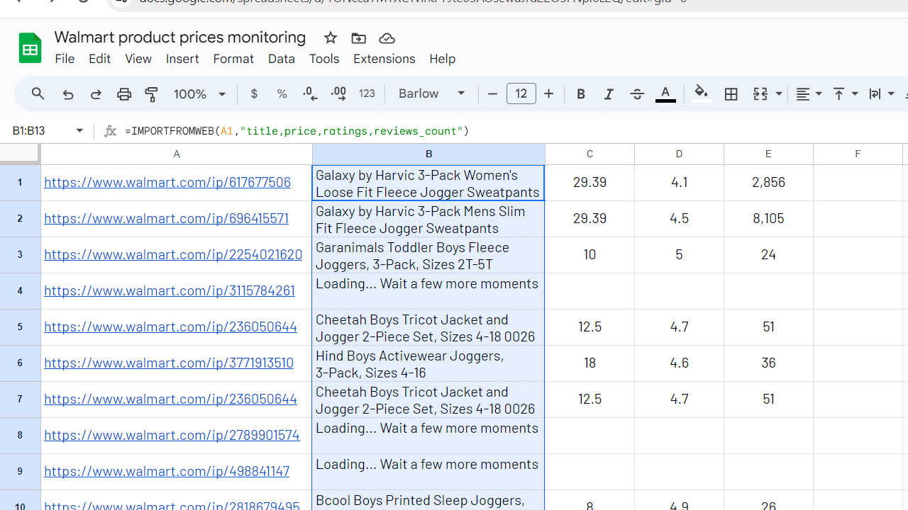 Now your Walmart price monitoring tool is ready, you can monitor the prices at your desired frequency. Whenever you open the spreadsheet and execute the =IMPORTFROMWEB() formula, you get an updated view over your results!