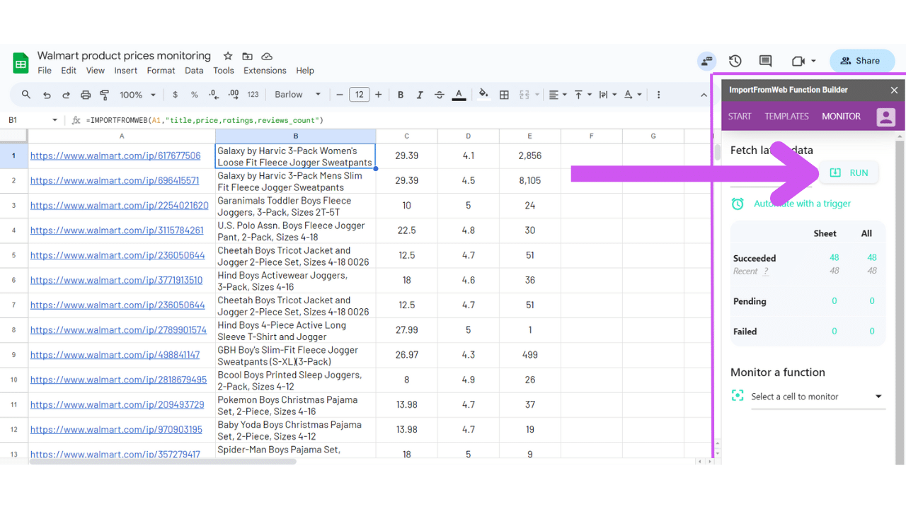 Considering you have a list of Walmart product URLs and you want to extract and monitor their prices. This 3 steps guide teaches you how to proceed using ImportFromWeb. Let’s dive in!