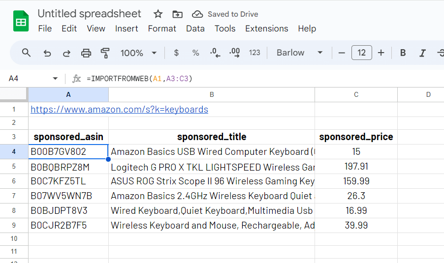 This is the function (to be written in A4) that allows you to extract the data for your Amazon Search results URL: =IMPORTFROMWEB(A1,A3:C3)