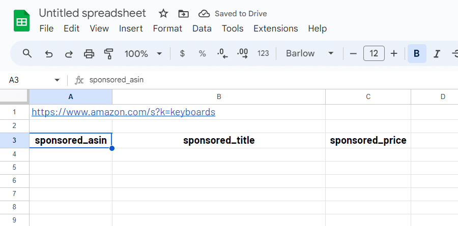 Write the following selectors in A3:C3 : sponsored_asin, sponsored_title, sponsored_price