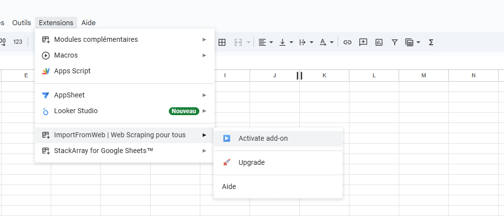 Once installed, open a new spreadsheet and activate the add-on from the Extensions menu.