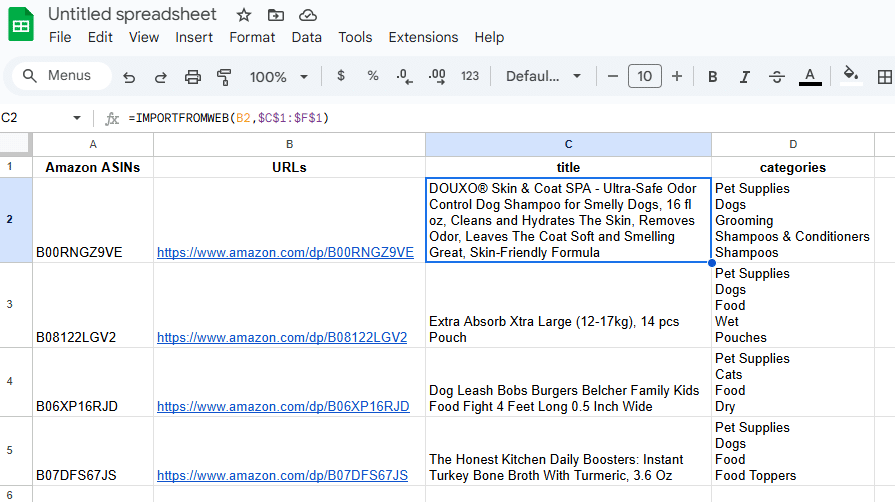 A product listed in the wrong category in Amazon can seriously hurt its visibility, performance, and sales. Fortunately, with ImportFromWeb in Google Sheets, you can quickly identify spot wrong-category listings on Amazon and take corrective action.