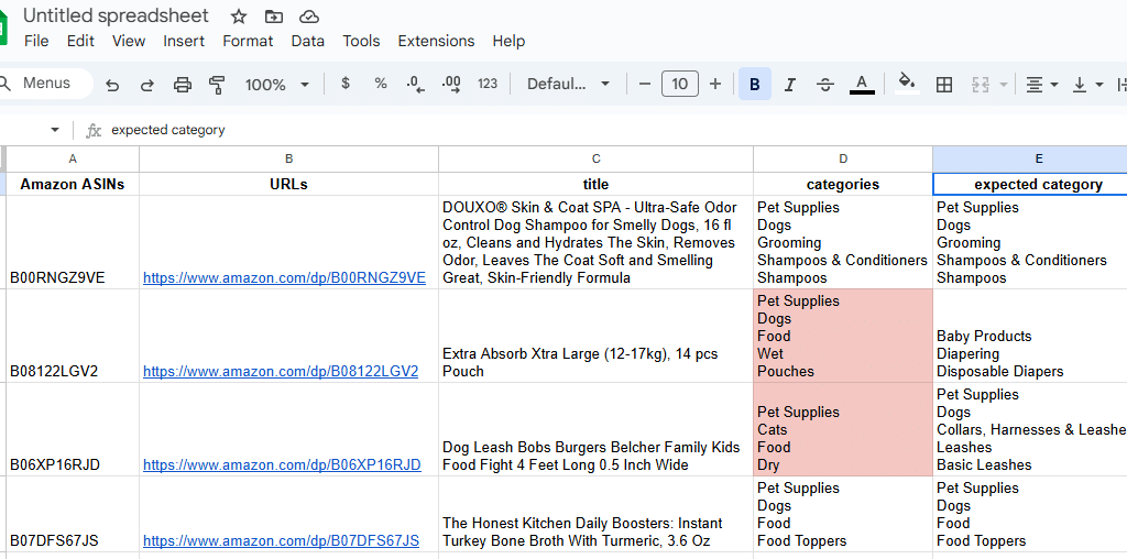 Add another column called Expected category. This column acts as a reference for the correct category or subcategory of each product, allowing you to compare it directly with the actual category pulled from Amazon.