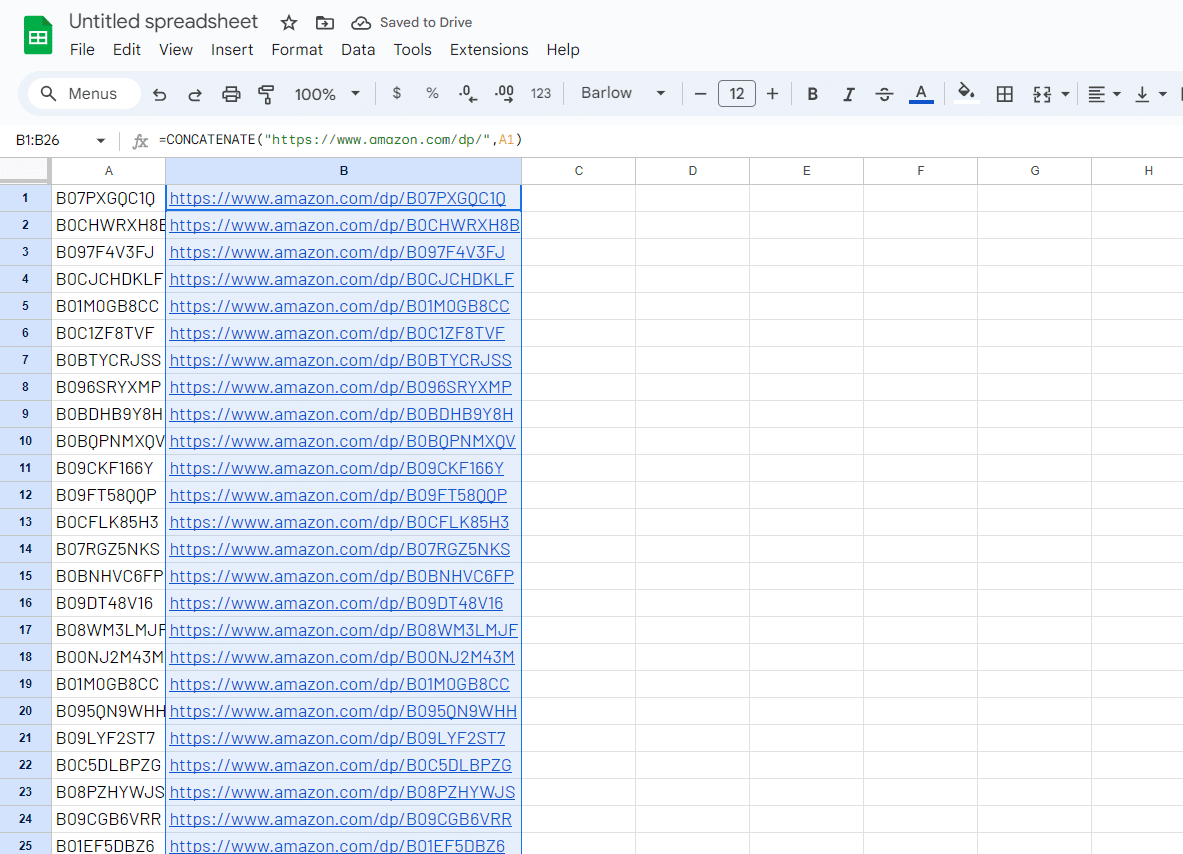 Then build each ASIN URL with the following formula in column B (for amazon.com):