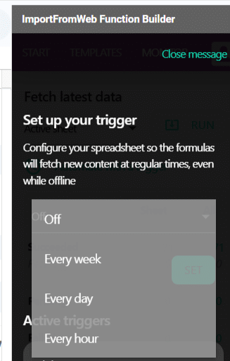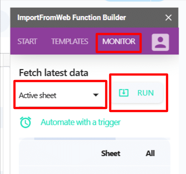 There are 2 ways to execute the =IMPORTFROMWEB() formulas after this first run, both from the ImportFromWeb sidebar (open it from the Extensions menu >> ImportFromWeb >> Open sidebar).