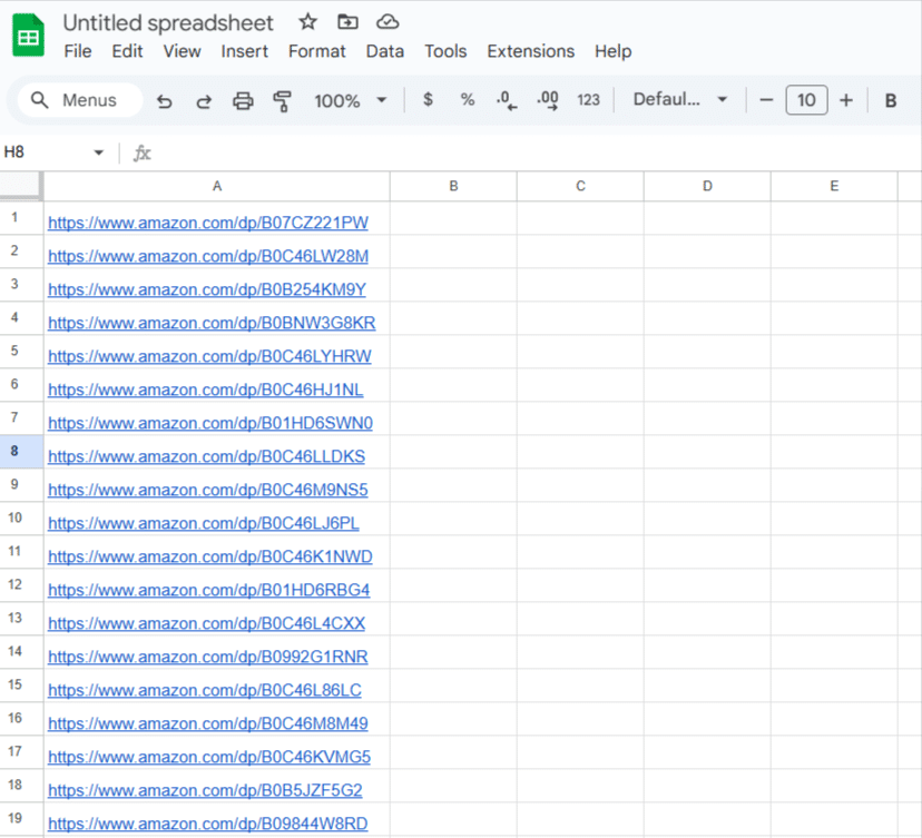 In the first column (column A), add the URLs of your Amazon listings. Please note that you can also automatically build their URLs from the ASINs using this simple formula: =”https://amazon.com/dp/”&A1