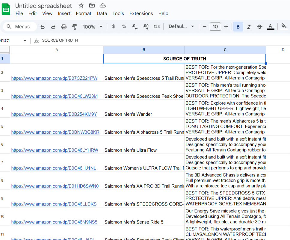 - List Your Products: In Google Sheets, input the URLs of your Amazon product pages alongside your original, “source of truth” content (e.g., title, description, bullet points).
