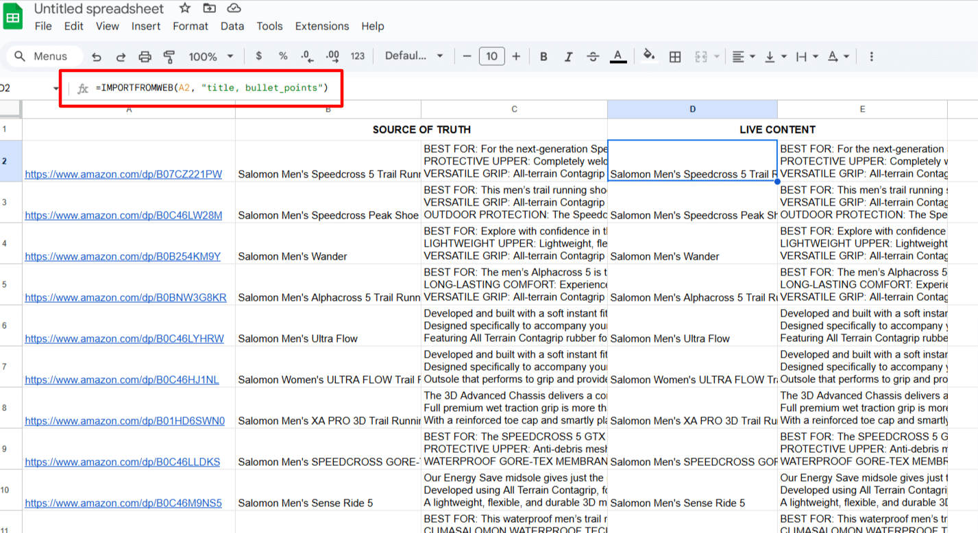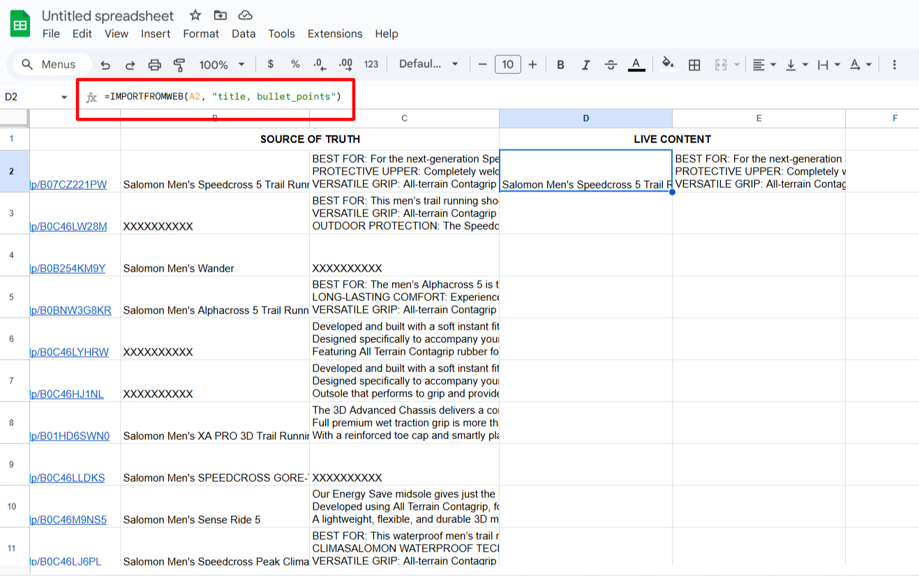 In the adjacent columns (D onwards), use the formula to extract live content from the listings. In our case, to extract the live title and bullet points of your listings, we will input the following formula in D2: