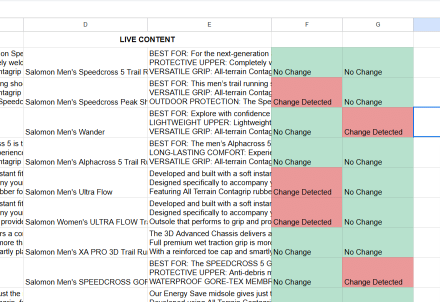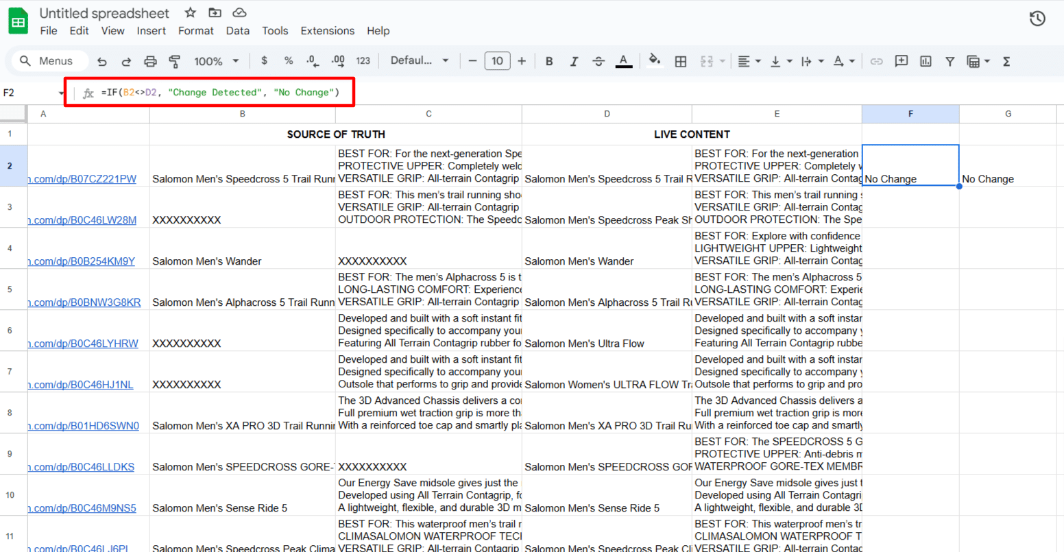Use a simple formula like =IF(B2<>D2, "Change Detected", "No Change") to flag discrepancies between your original title and title live value. And the same goes for the bullet points.