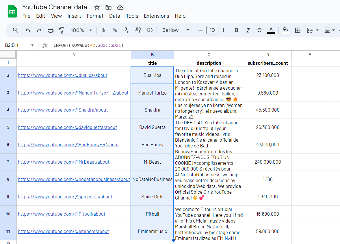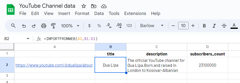 Let’s write the following function in B2: =IMPORTFROMWEB(A2,$B$1:$D$1) to retrieve the 1st channel title, description, and number of subscribers.