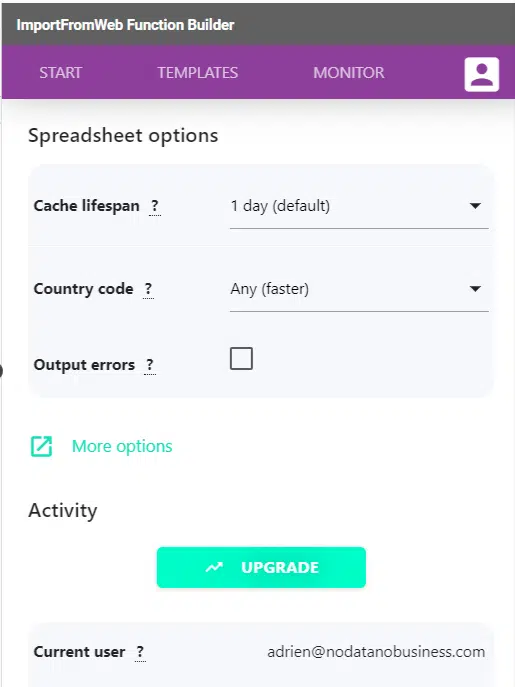 First, let’s check the ImportFromWeb account associated with your spreadsheet. In the sidebar (My account tab), you’ll see the email address displayed.