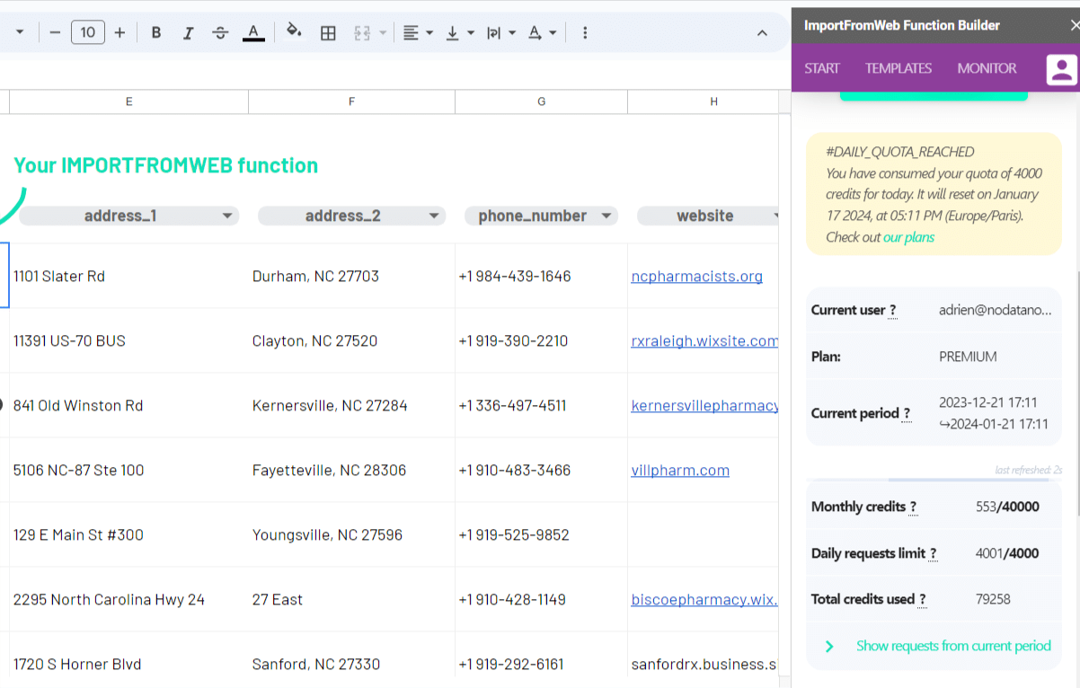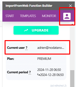 First, let’s check the ImportFromWeb account associated with your spreadsheet. In the sidebar (My account tab), you’ll see the email address displayed.
