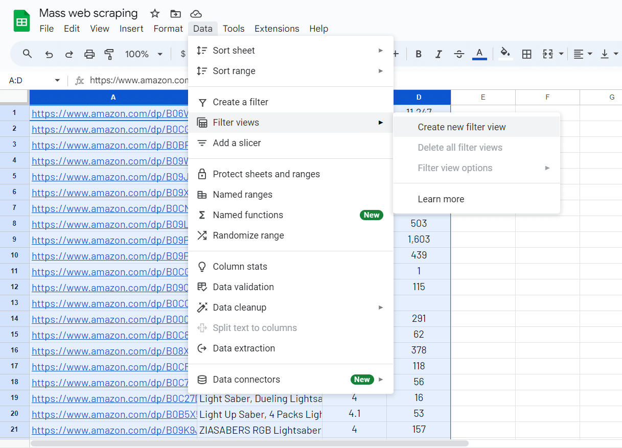 Step 1. Select the range of data you want to filter and go to Data > Filter views > Create new filter view.