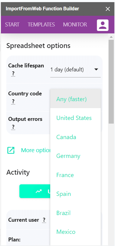 The IMPORTFROMWEB() formula comes with a set of powerful options. And in order to scrape content or data that is location based, there’s the country_code option. Using it, you control the location and our bots fetch the webpage from an IP address of the specified location/country.