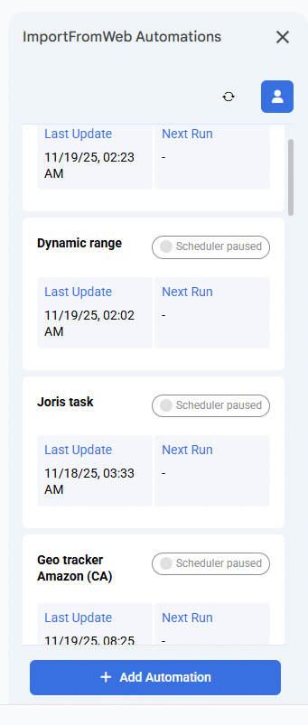 ImportFromWeb comes with 2 sidebars, depending on the solution you’re using, i.e. the =IMPORTFROMWEB() formula or ImportFromWeb automations. Each of them can be open from the spreadsheet menu in Extensions > ImportFromWeb.