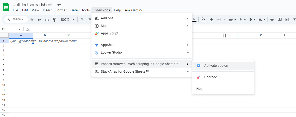 ImportFromWeb needs two inputs: a URL and at least one data selector.