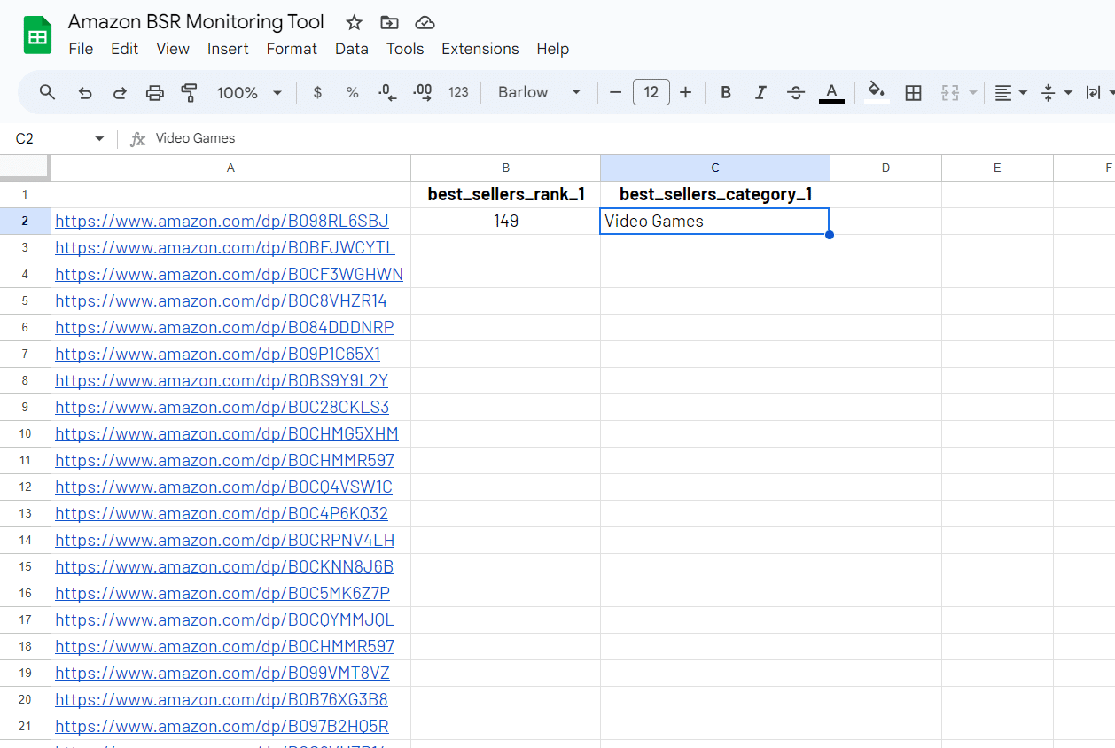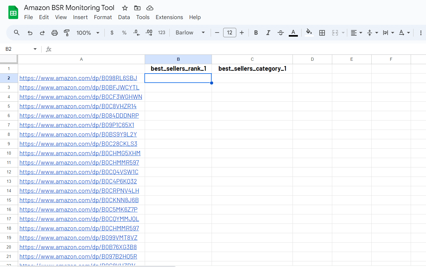 Pick the selectors you are interested in from our Amazon product selectors glossary and add them to your spreadsheet. For example, you may be interested in the best_sellers_rank_1 and best_sellers_category_1.