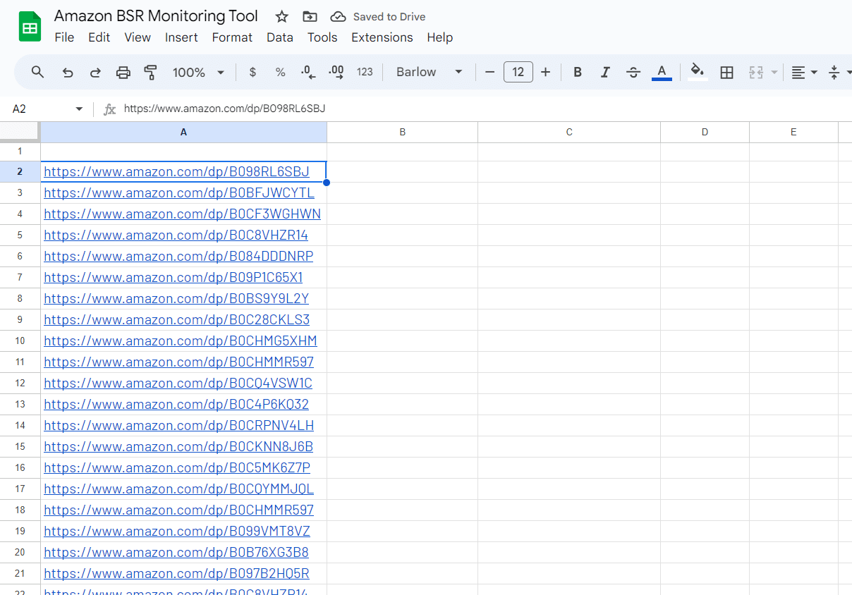 You can input the product URLs directly or build them using the product ASINs: =”https://www.amazon.com/dp/”&A2 (where column A contains all your ASINs).