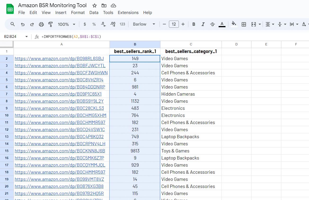 Using the ImportFromWeb add-on and the function it adds to Google Sheets, you can extract Amazon BSR data in bulk without technical knowledge!