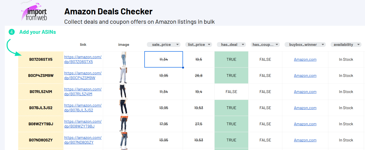 To build an Amazon Deals Checker, you need the sale_price, the list_price, the has_deal andthe has_coupon data selectors. You can find the full list in our Amazon product selectors glossary.