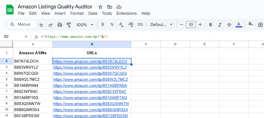 You can input the product URLs directly or build them using the product ASINs: ="https://www.amazon.com/dp/"&A2 (where column A contains all your ASINs).