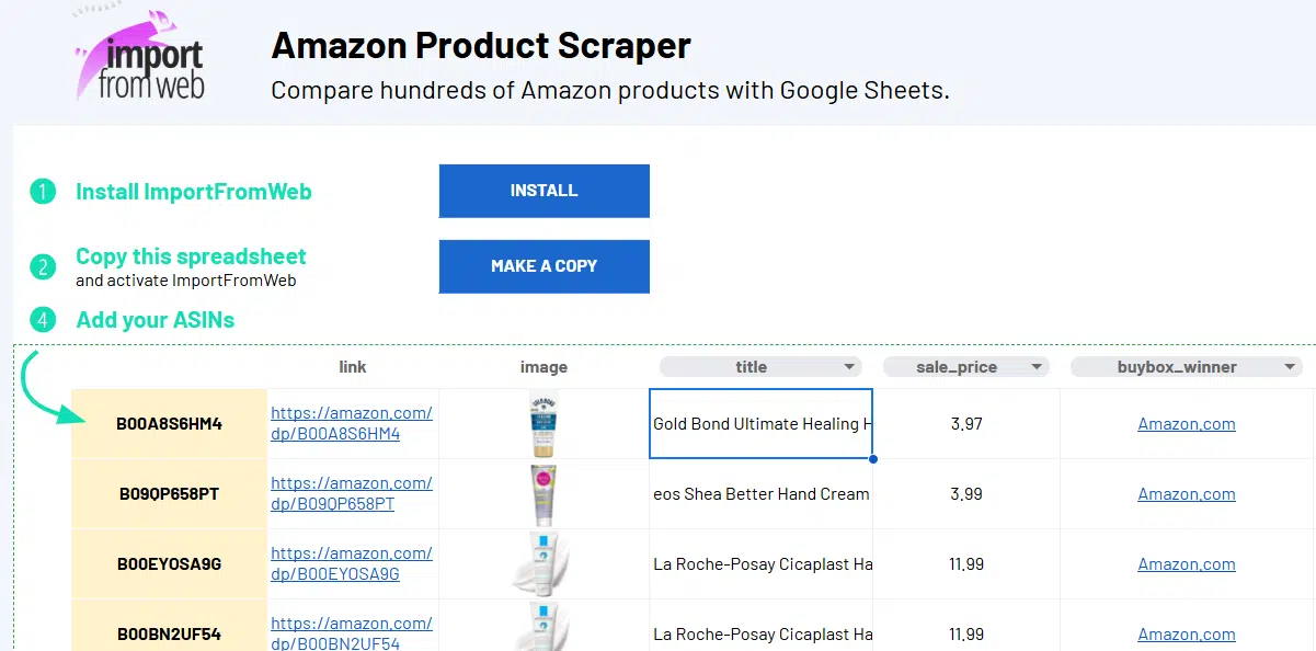 We’ve designed an easy-to-use template so you can try our Amazon Product Scraper. Make sure you have installed and activated ImportFromWeb in your Google Sheets.