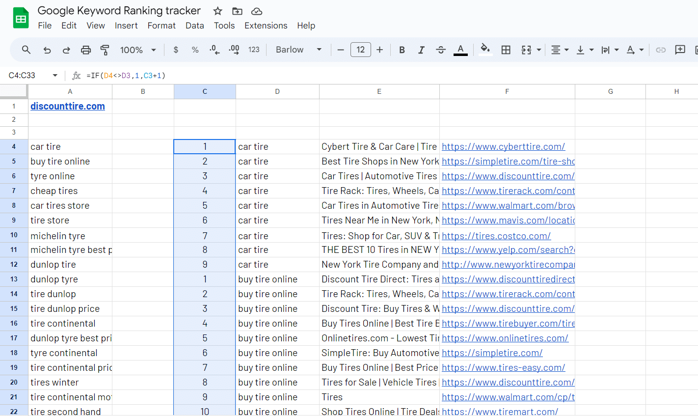 Now, we want to add the rank of each result. Simply add the following formula in cell C4: =IF(D4<>D3,1,C3+1)