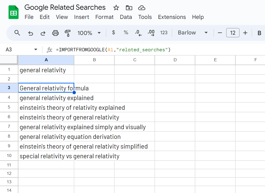 Write the =IMPORTFROMGOOGLE() function and extract related searches