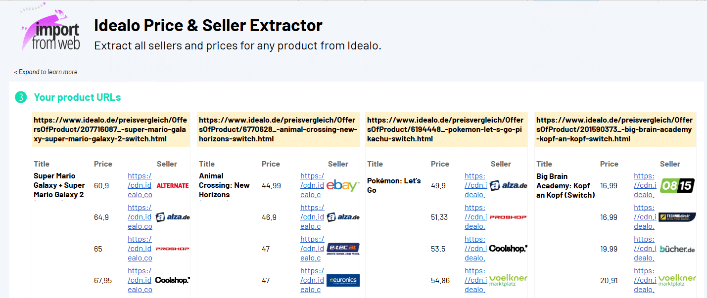 We’ve designed an easy-to-use template so you can try our Idealo Price & Seller Extractor.
