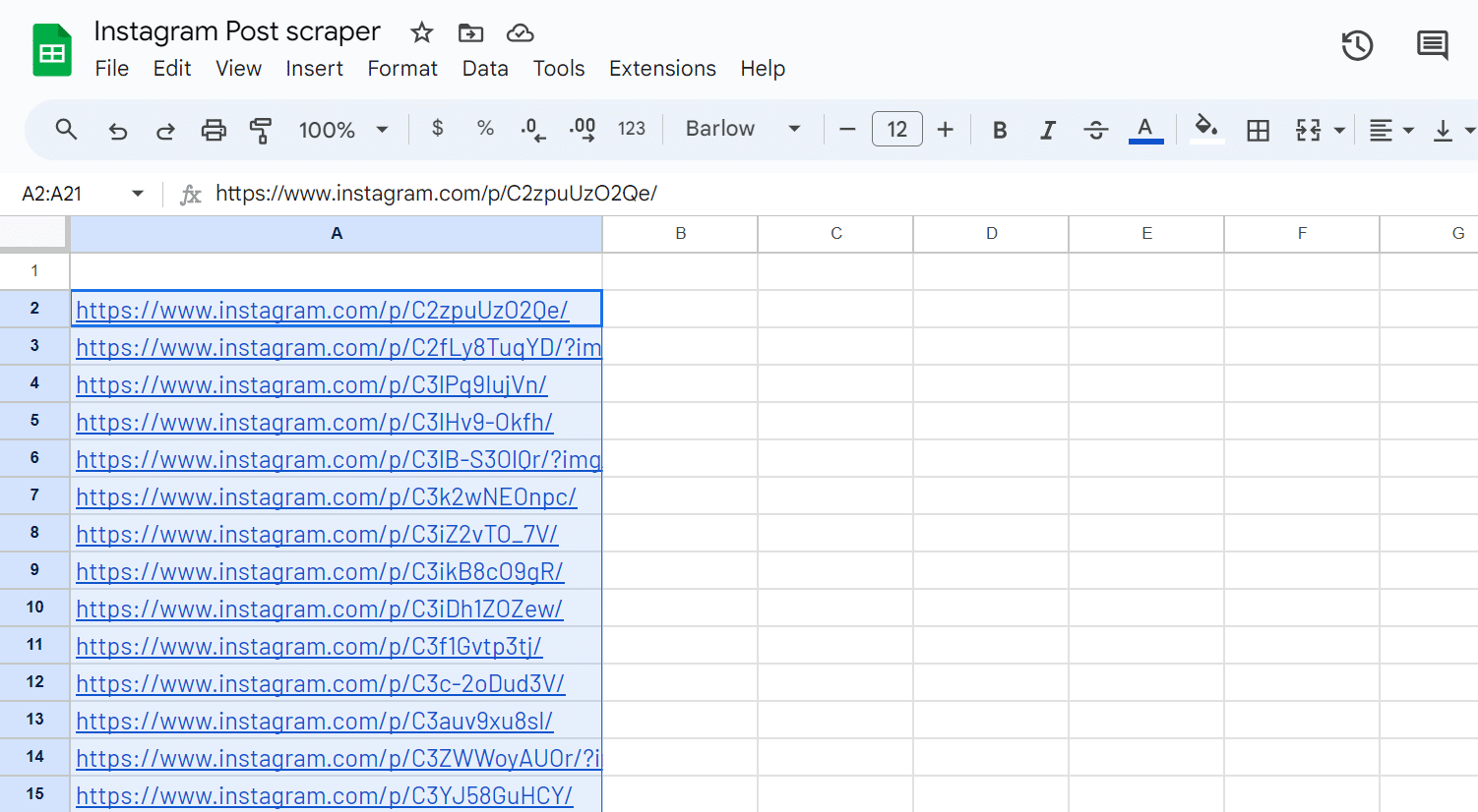 Copy the URLs for the Instagram posts to your spreadsheet.