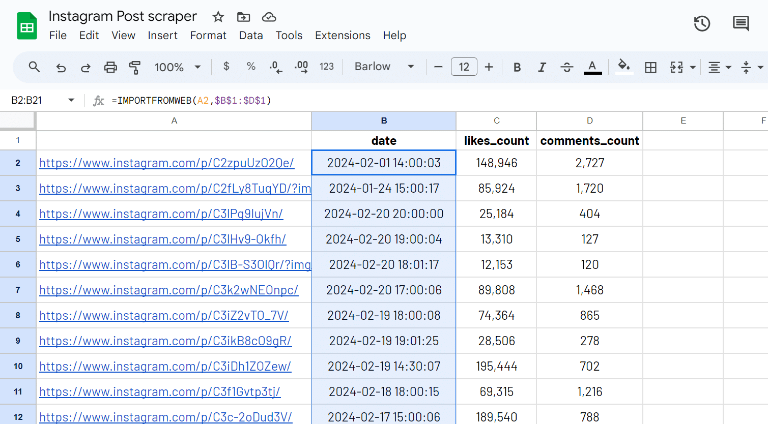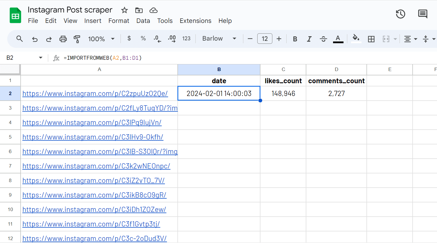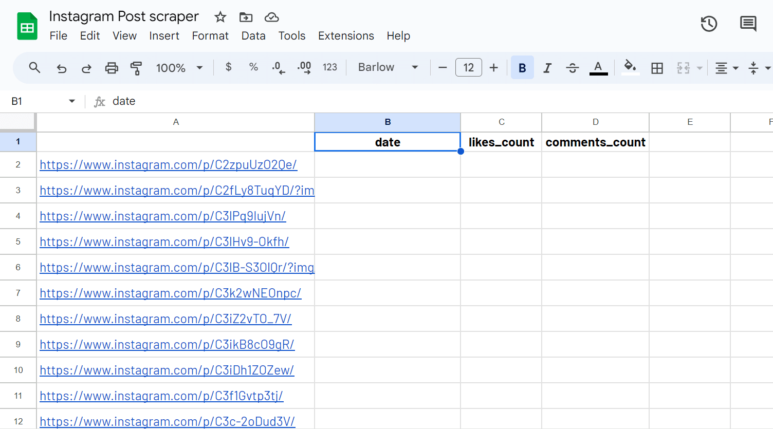 Pick the selectors you are interested in from our Instagram selectors glossary and add them to your spreadsheet. For example, you may be interested in the date, likes_count and comments_count.