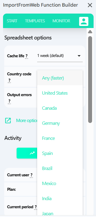 The IMPORTFROMWEB() formula comes with a set of powerful options. And in order to scrape content or data that is location based, there’s the country_code option. Using it, you control the location and our bots fetch the webpage from an IP address of the specified location/country.
